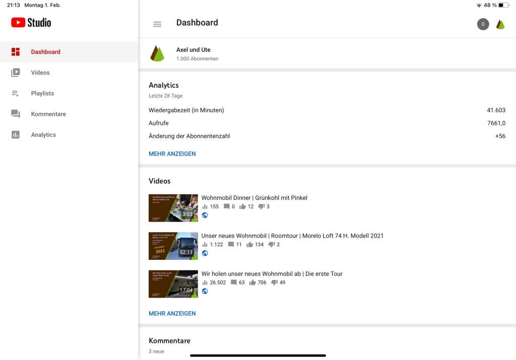 Vor zwei Tagen haben wir unser neues Roomtour-Video hochgeladen. Kurze Zeit darauf erreichte abends unser Kanal die 1000-Abonnenten-Marke. Wow. Wir sind beeindruckt.