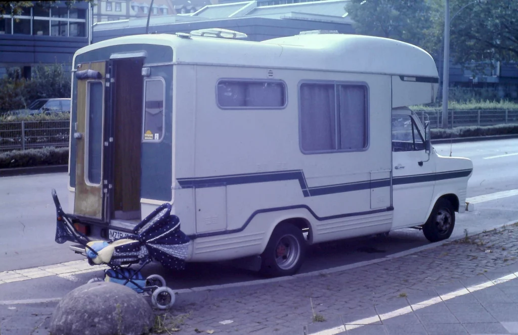 Das erste Kind war geboren, da brauchte es etwas mehr Platz. Englischer Aufbau mit Hecktür. Eine Heizung mit Warmwasseraufbereitung, die nur kochendes Wasser produzieren konnte. Der typische Geruch im Innenraum, wenn Wohnmobile mehr als 15 Winter im Freien verbracht haben. Eine alte 6-Zylinder-Maschine (Benziner) aus einem Ford Granada mit 90 PS, die hier nachträglich verbaut wurde, hat auch nicht jeden TÜV-Prüfer auf Anhieb überzeugt.