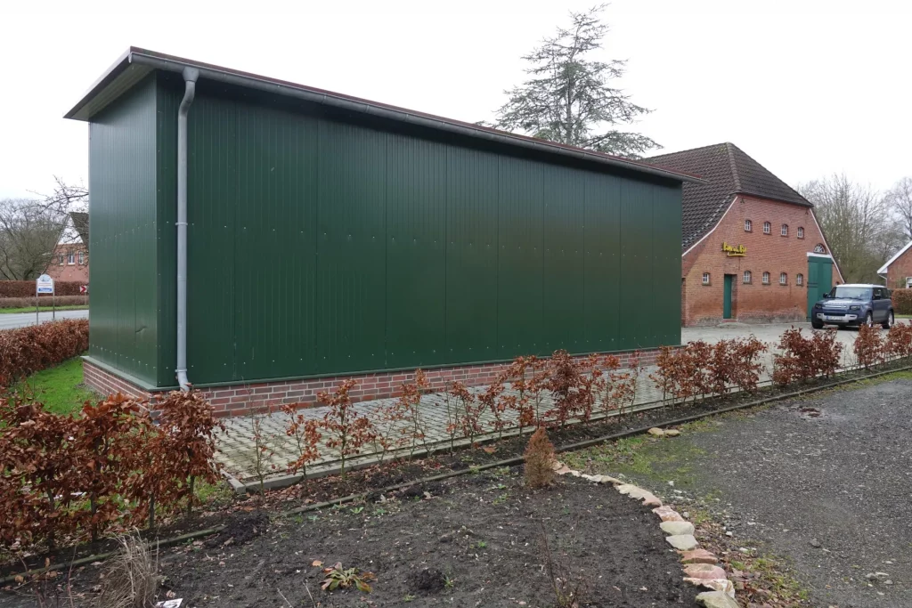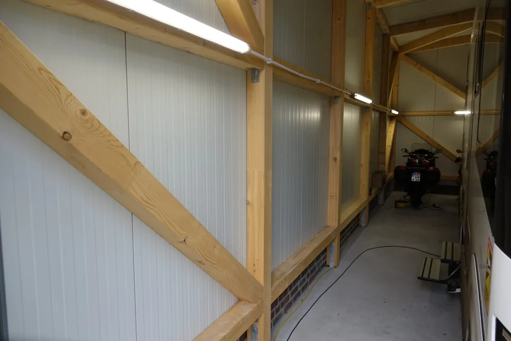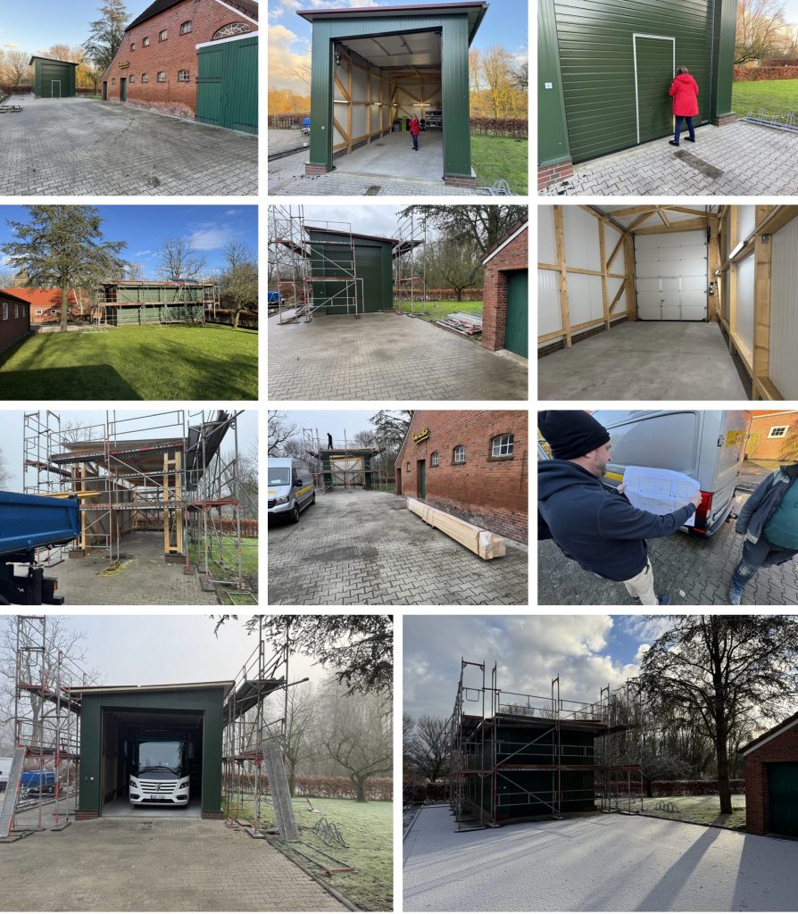 Da wir noch Platz auf unserem Grundstück hatten und wir uns sicher waren, dass wir in Zukunft ein Wohnmobil mal fahren würden, welches nicht in die Scheune unseres alten Bauernhauses hineinpasst, hatten wir uns im Jahr 2018 dazu entschlossen eine kleine Halle für ein Wohnmobil zu bauen. Bei den angebotenen Bausätzen hatten wir nichts für uns passendes gefunden. Zur Auswahl stand deshalb der Bau einer klassischen Stahlhalle mit dünnen Blechwänden oder ein konventioneller Bau mit einem Holzrahmen und Sandwichpaneelen. Wir entschieden uns für die zuletzt genannte Variante. Die Planung und Ausführung erfolgte durch das Bauunternehmen Johann Bohlen GmbH, Hatshausen.