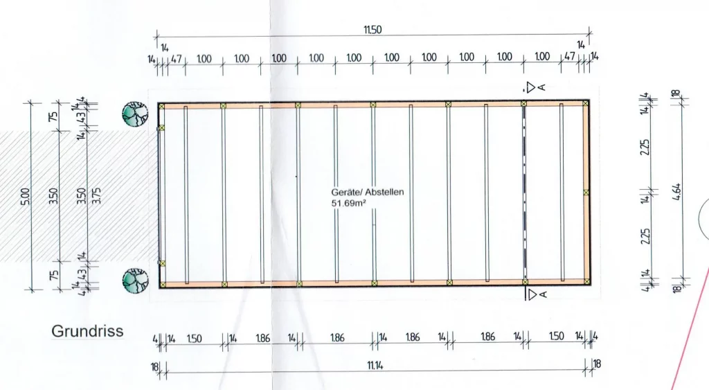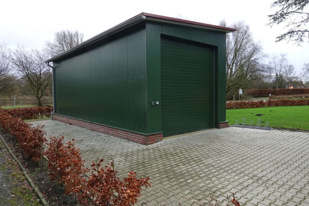 Wir würden eine Schlupftür im Rolltor oder eine separate Tür empfehlen. Für den Fall, dass mal der Strom ausfallen sollte oder der Motor des Rolltors nicht funktionieren sollte lässt sich die Halle nicht ohne weiteres öffnen. Man müsste in die Außenhaut eine Noteinstiegsöffnung hineinschneiden oder das Rolltor mit einem Gabelstapler hochdrücken. Auch letzteres wäre vermutlich nicht schadensfrei möglich. - Dachneigung / PV-Anlage (Lösung in 01/2025 realisiert)