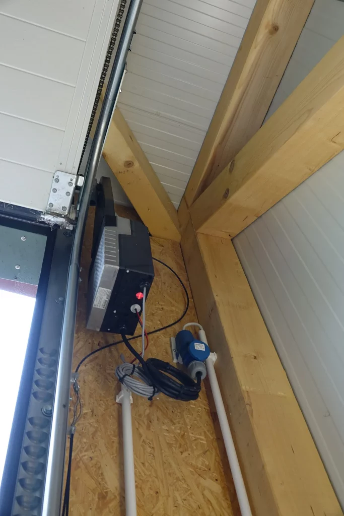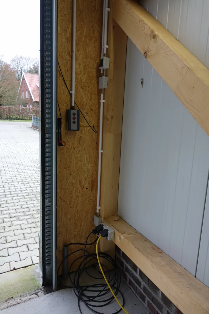Die gesamte Elektrifizierung erfolgt über ein Erdkabel, welches von der Scheune zur Halle verlegt wurde. Ein einfaches Erdkabel mit 3 x 2,5 mm. Die rudimentäre Verkabelung und die Installation der Beleuchtung haben wir selbst eingebaut.