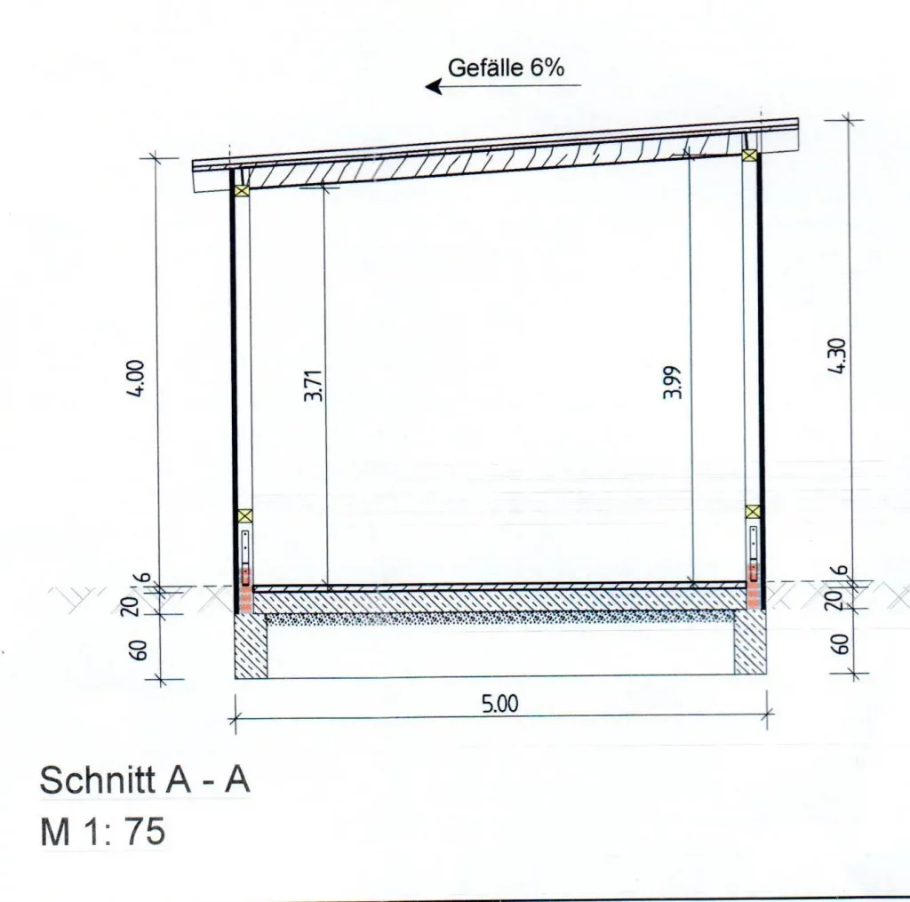 Bei dem Bau handelt es sich um den Neubau eines Nebengebäudes. Der Baugrund besteht aus Sandboden. Das Grundwasser steht ca. 1,50 m unter dem Gelände. Regenwasser wird in die öffentliche Kanalisation abgeleitet. Der Rohbau besitzt Beton-Streifenfundamente (C20/25). Für die Außenwände wird ein Holzrahmen erstellt. Eine Holzbalkendecke trägt das Pultdach, welches – genau wie die Außenhaut – aus Sandwichpaneelen besteht. Die Außenhaut selbst steht auf einem Sockelmauerwerk. Der Fußboden besteht aus einer durchgängigen Estrichfläche auf Trennschicht. Einziger Zugang ist ein elektrisches Rolltor.
